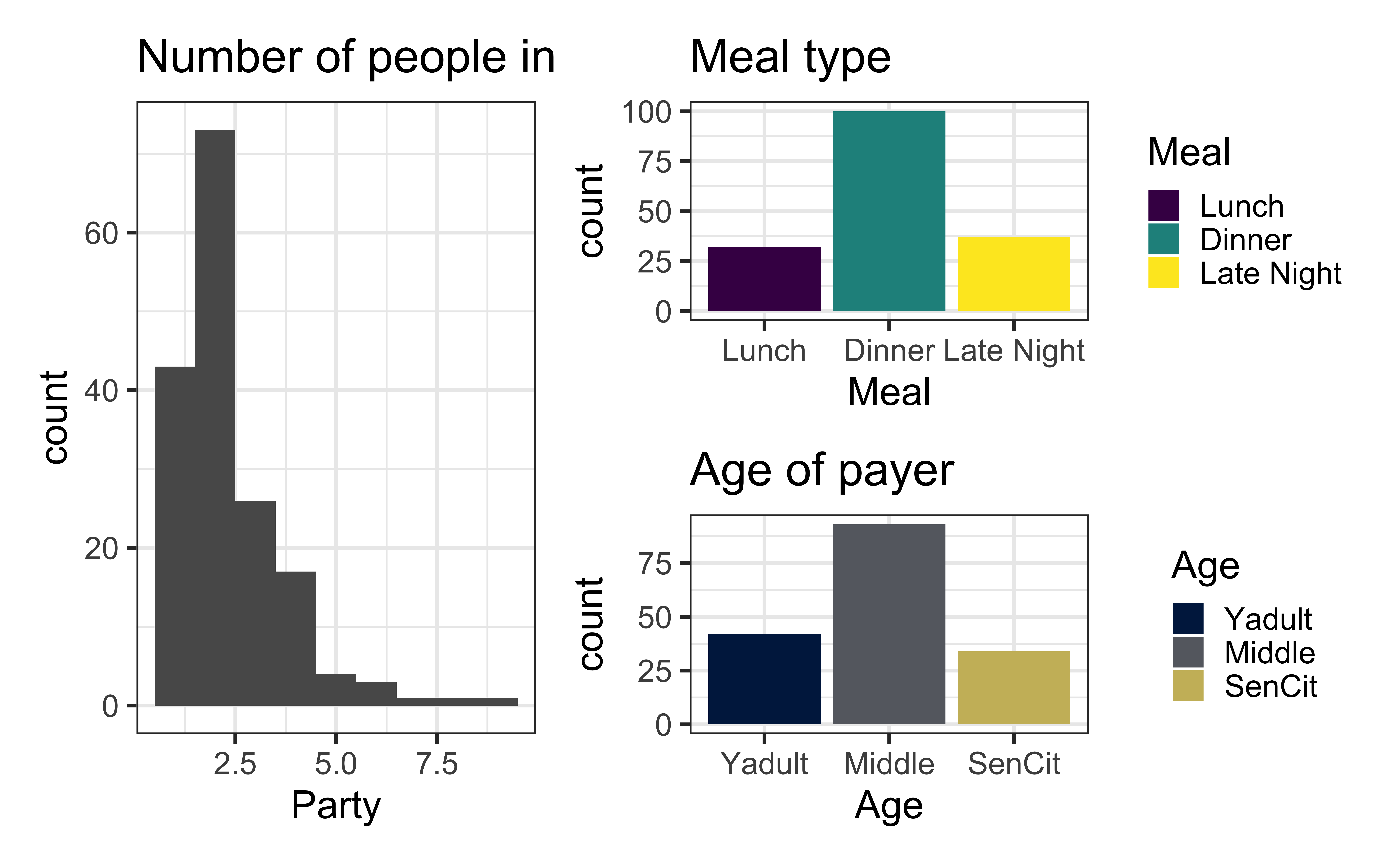 Party: Number of people in the partyMeal: Time of day (Lunch, Dinner, Late Night)Age: Age category of person paying the bill (Yadult, Middle, SenCit)Outcome: Tip: Amount of tip