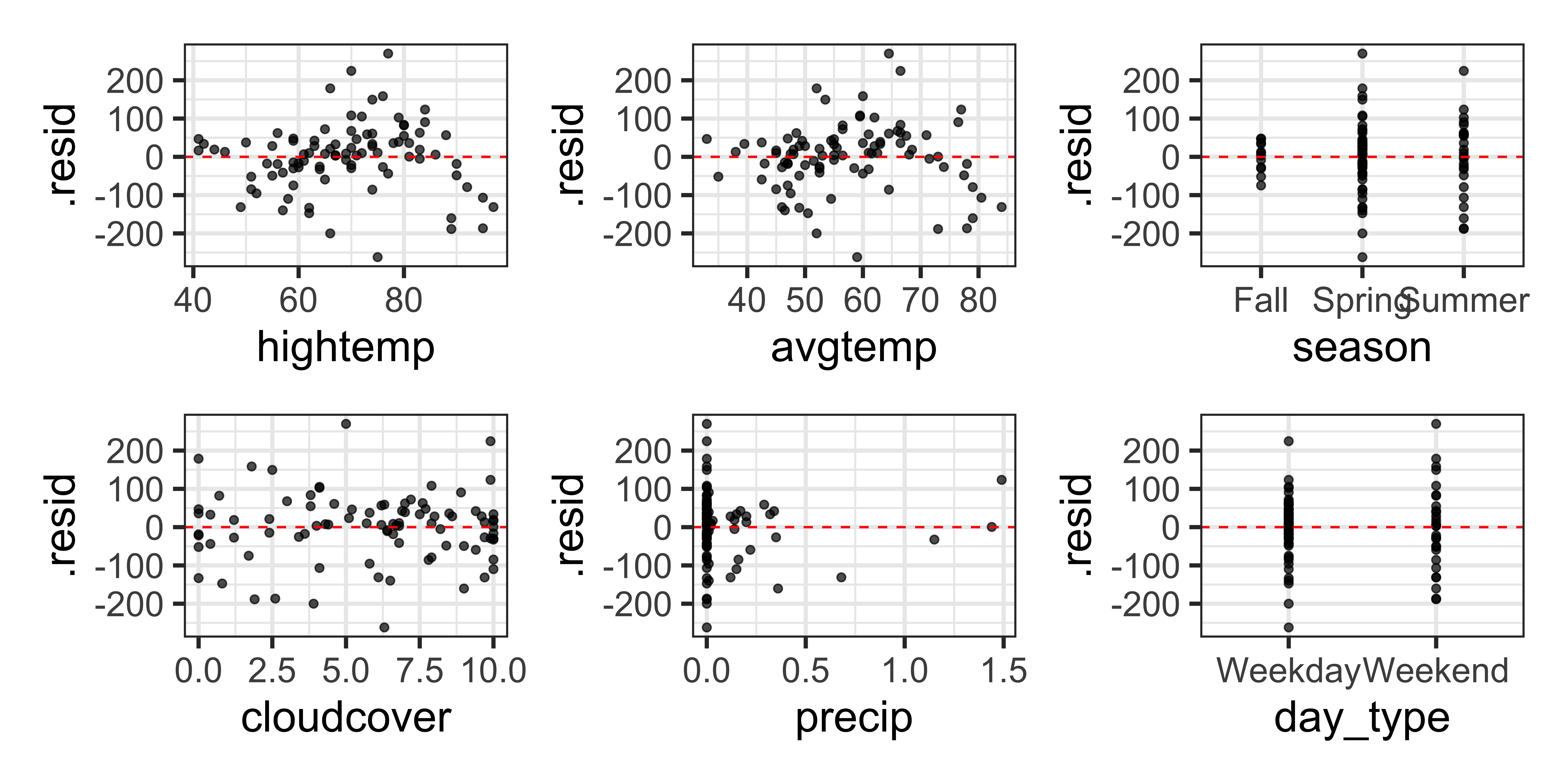 The plots of residuals vs. hightemp and avgtemp appear to have a parabolic pattern.