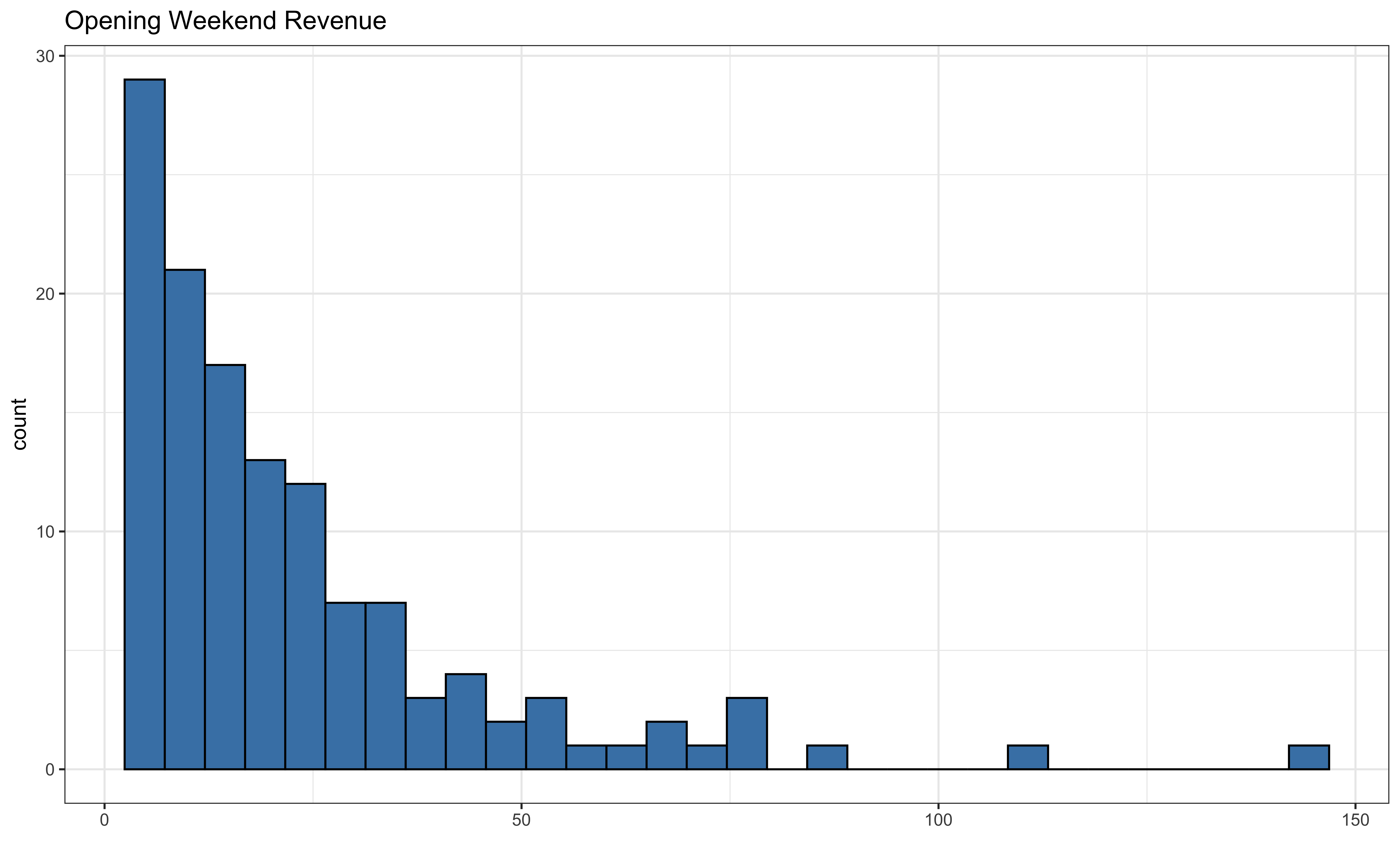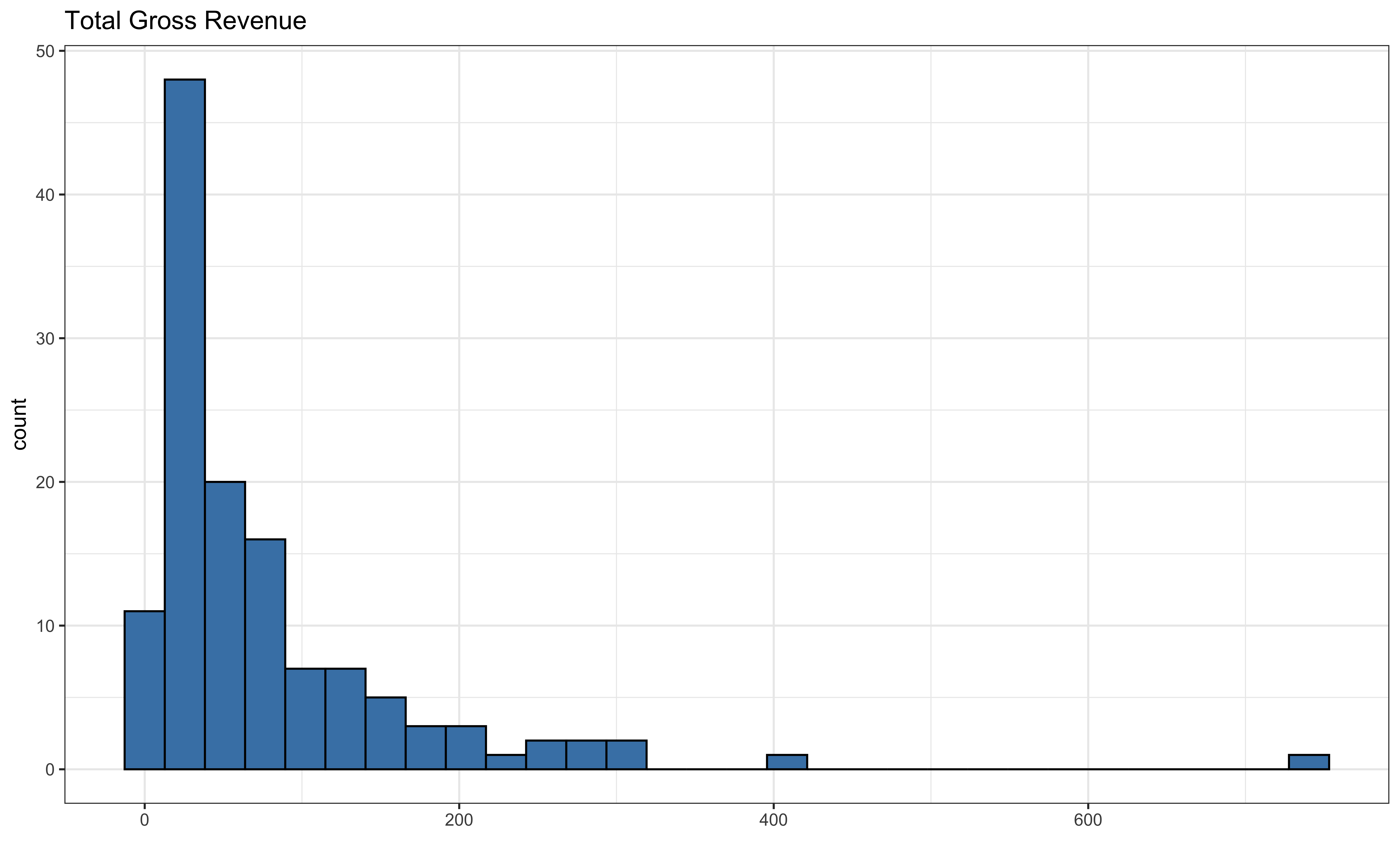 The goal of this analysis is to predict the total gross revenue of a movie using opening weekend statistics. The data set includes movies released in the U.S. in 2009 that opened on 500 or more theater screens. The data were obtained from Handbook of Regression Analysis.